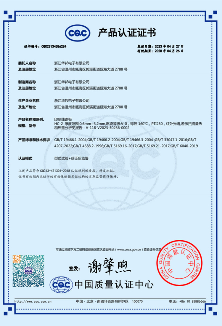 華邦通過(guò)了IATF16949證書(shū)、科技型中小企業(yè)證書(shū)、新型技術(shù)企業(yè)證書(shū)(有效期至2024年12月16日)、CQC證書(shū)等認(rèn)證精良的設(shè)備和生產(chǎn)工藝相結(jié)合,保證了每一款線路板出廠的產(chǎn)品都符合標(biāo)準(zhǔn)、符合客戶要求。