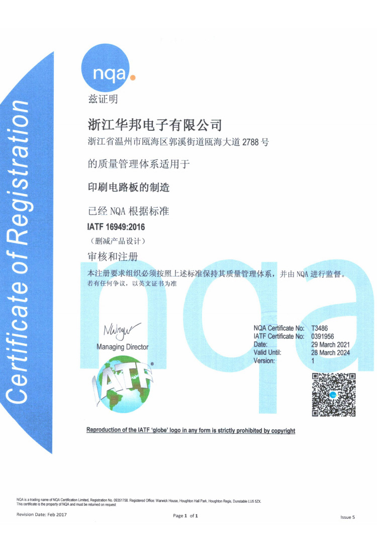 浙江華邦電子有限公司位于溫州市甌海經(jīng)濟(jì)開(kāi)發(fā)區(qū)C園區(qū),成立于2001年2月,是一家專門(mén)從事單、雙面及多層印制線路板的生產(chǎn)企業(yè)。榮獲美國(guó)UL安全認(rèn)證、IATF16949證書(shū)、科技型中小企業(yè)證書(shū)、新型技術(shù)企業(yè)證書(shū)(有效期至2024年12月16日)、CQC證書(shū)等。